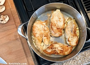 - Transfer the chicken to a plate and use the same pan to sauté the garlic and onions for 5 minutes. Toss in the mushrooms and leave for 5 more minutes or until some juices are produced and the base of the pan looks clean when stirring.